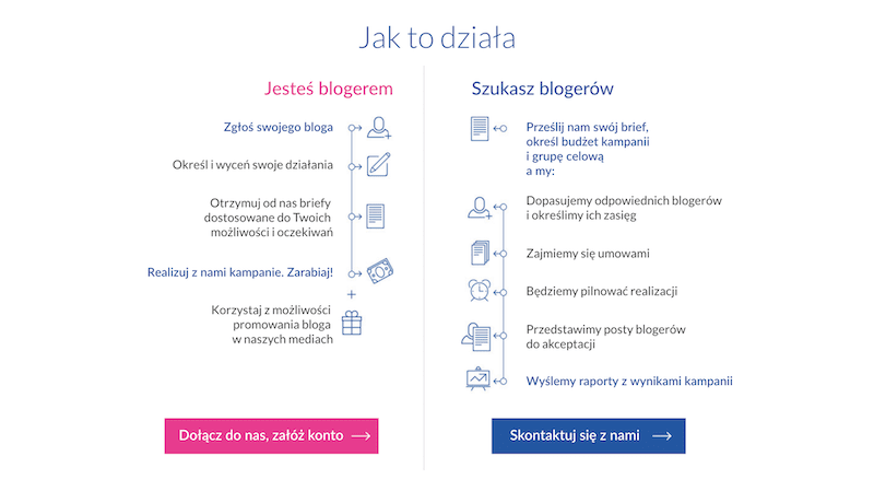 Aby zacząć przygodę należy podać adres mediów społecznościowych i/lub bloga, a następnie określić oraz wycenić działania możliwe do zrealizowania w ramach współpracy.
