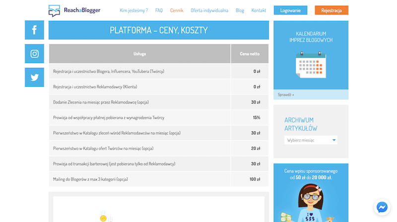 • Prowizja od transakcji (pobierana od wynagrodzenia Blogera (15%)